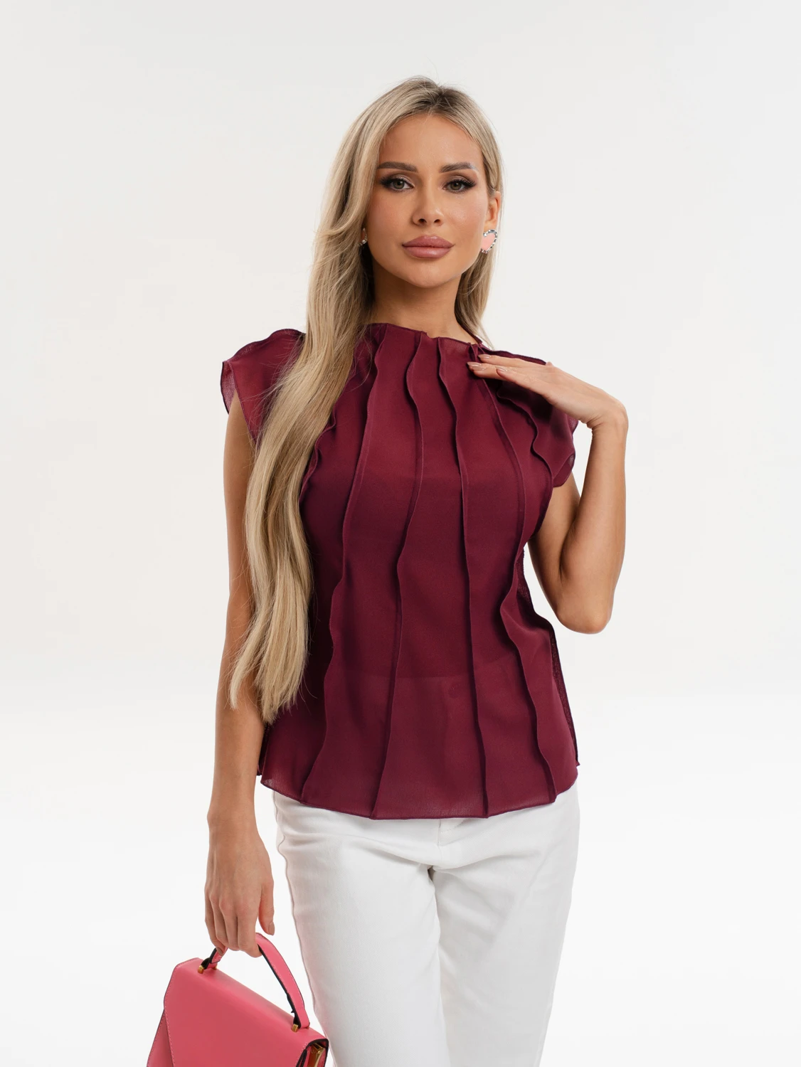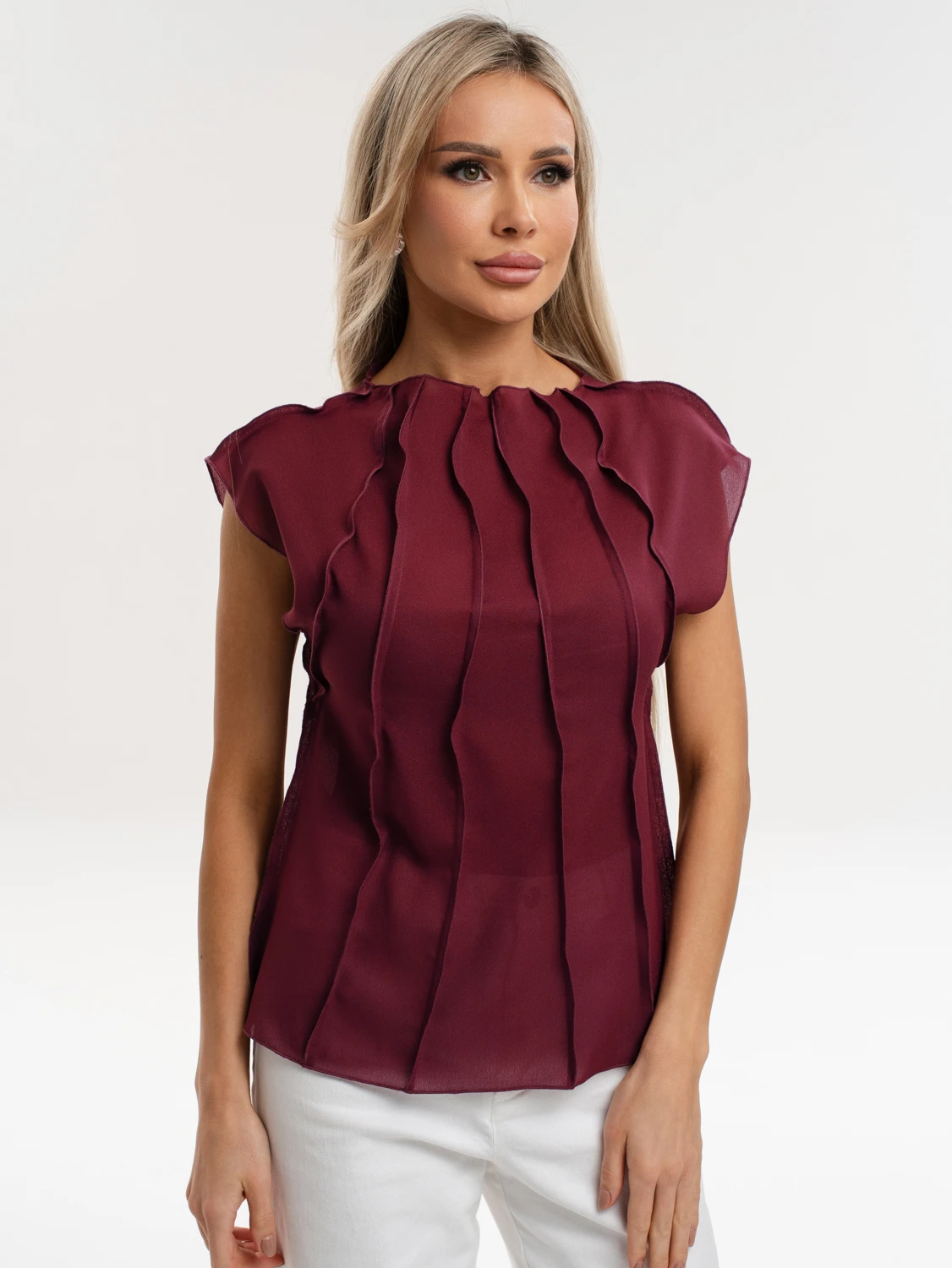 Блуза из креп-шифона с декоративными вертикальными отстрочками по всему изделию.