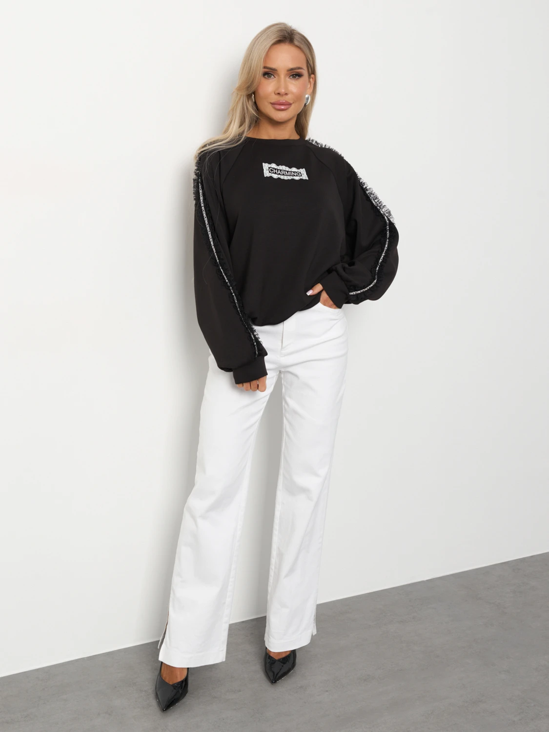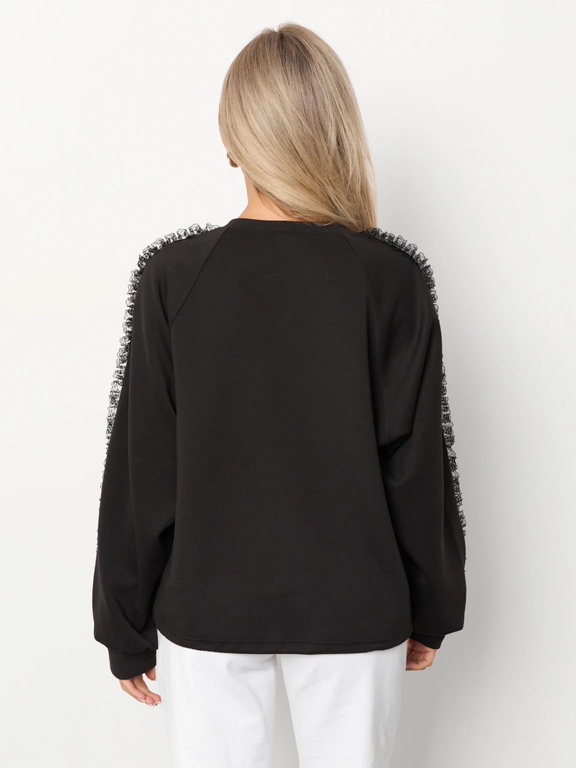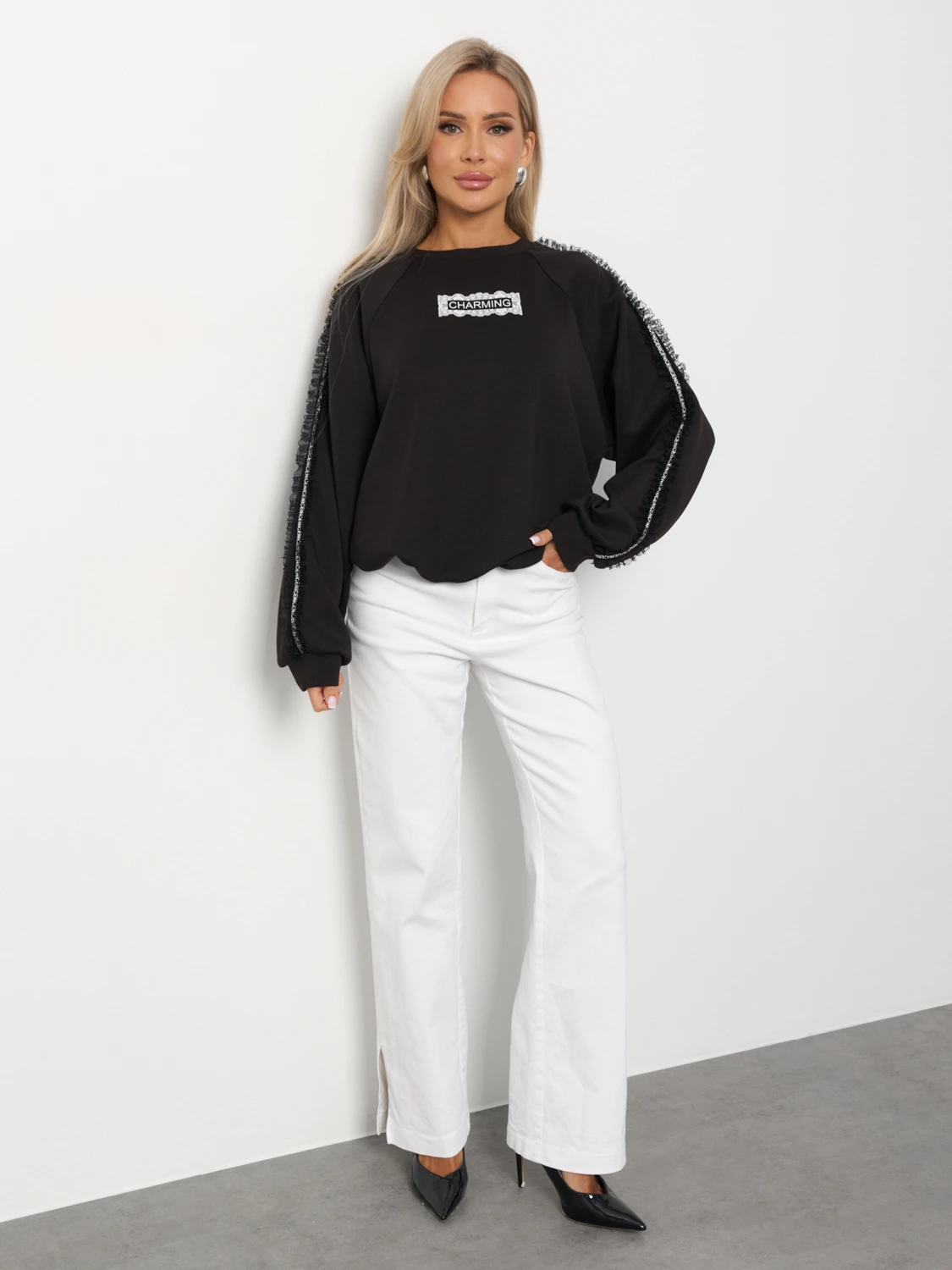 По низу изделия вшита кулиска, что позволяет носить джемпер как свободным, так и собрать его на кулиску.