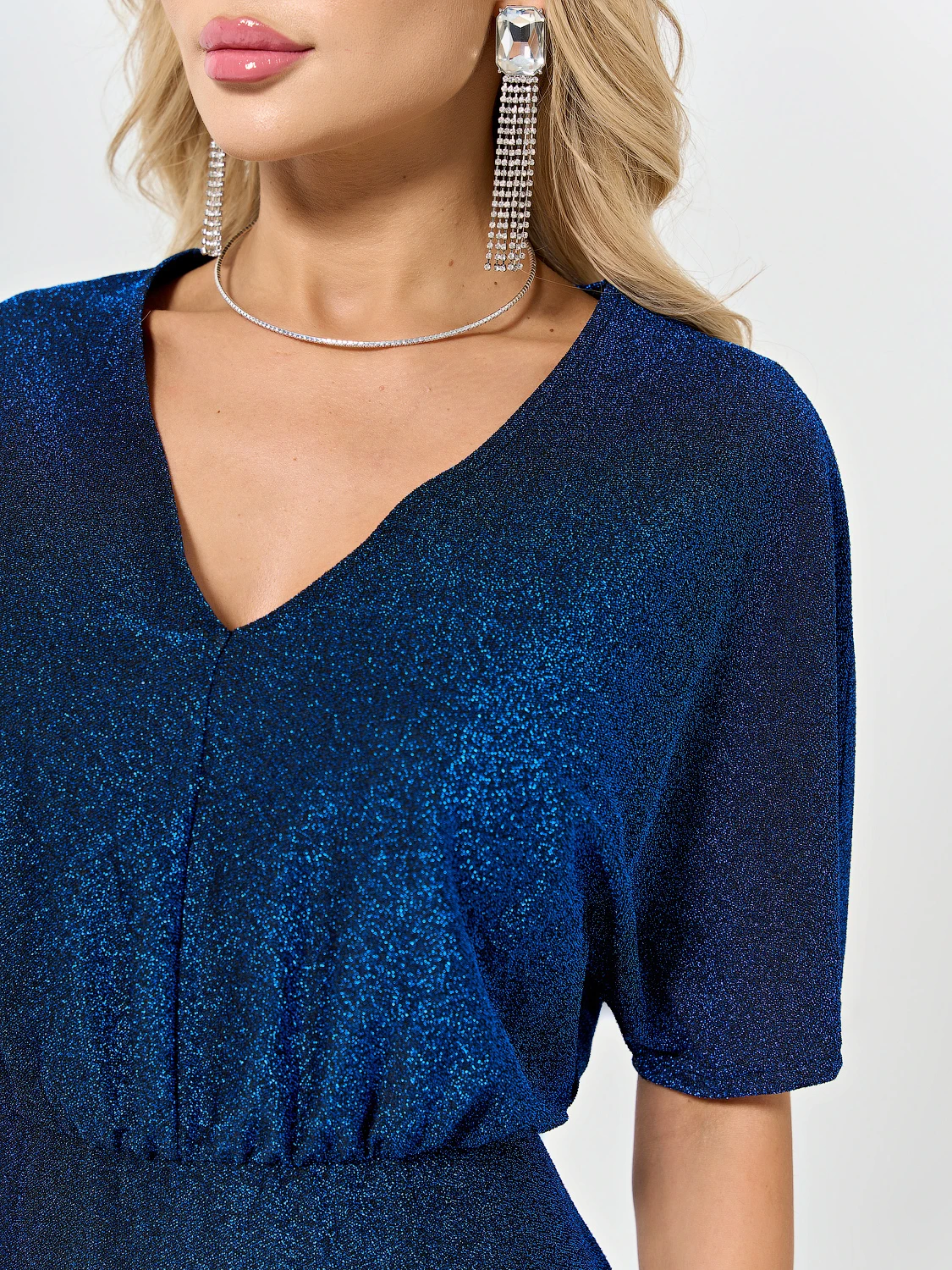 Отрезная линия талии, V-образный вырез горловины, цельнокроеный короткий рукав.