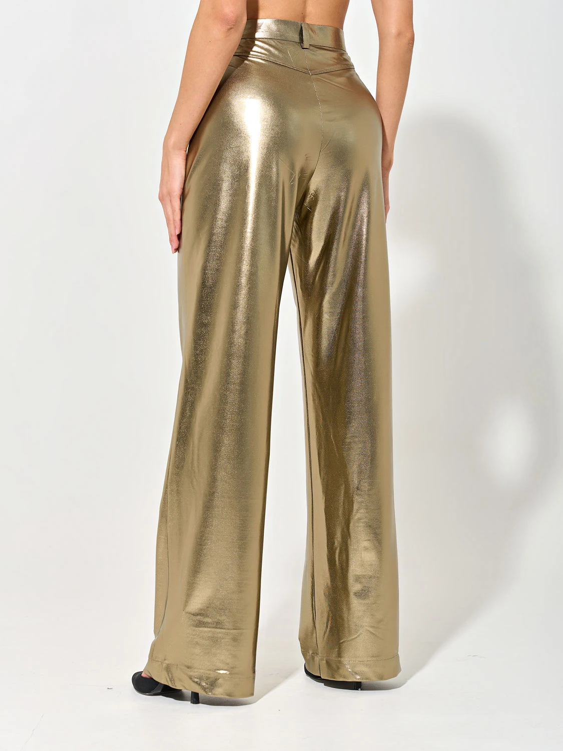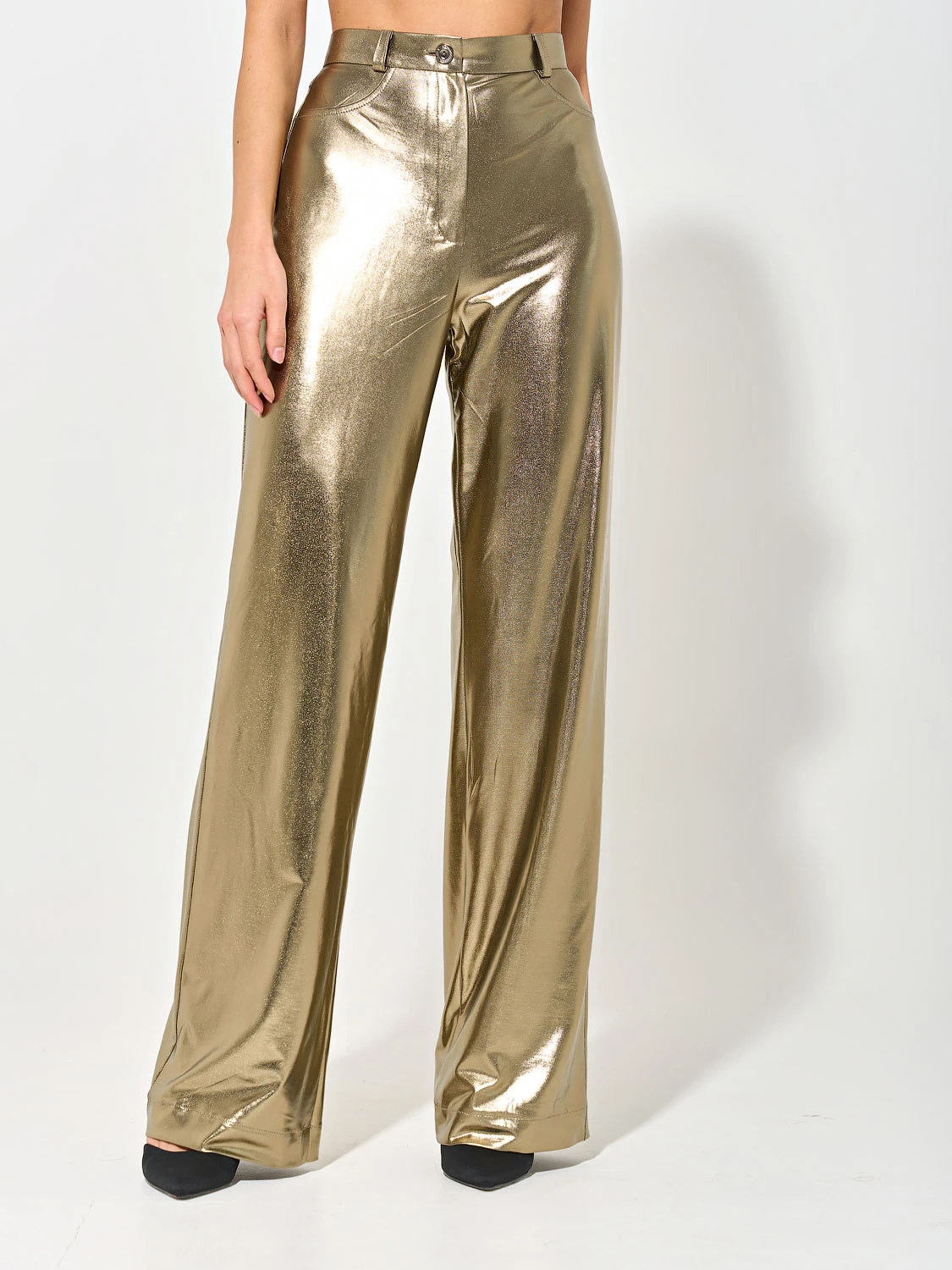 Прямые брюки из тонкого эластичного трикотажа с металлизированным напылением.