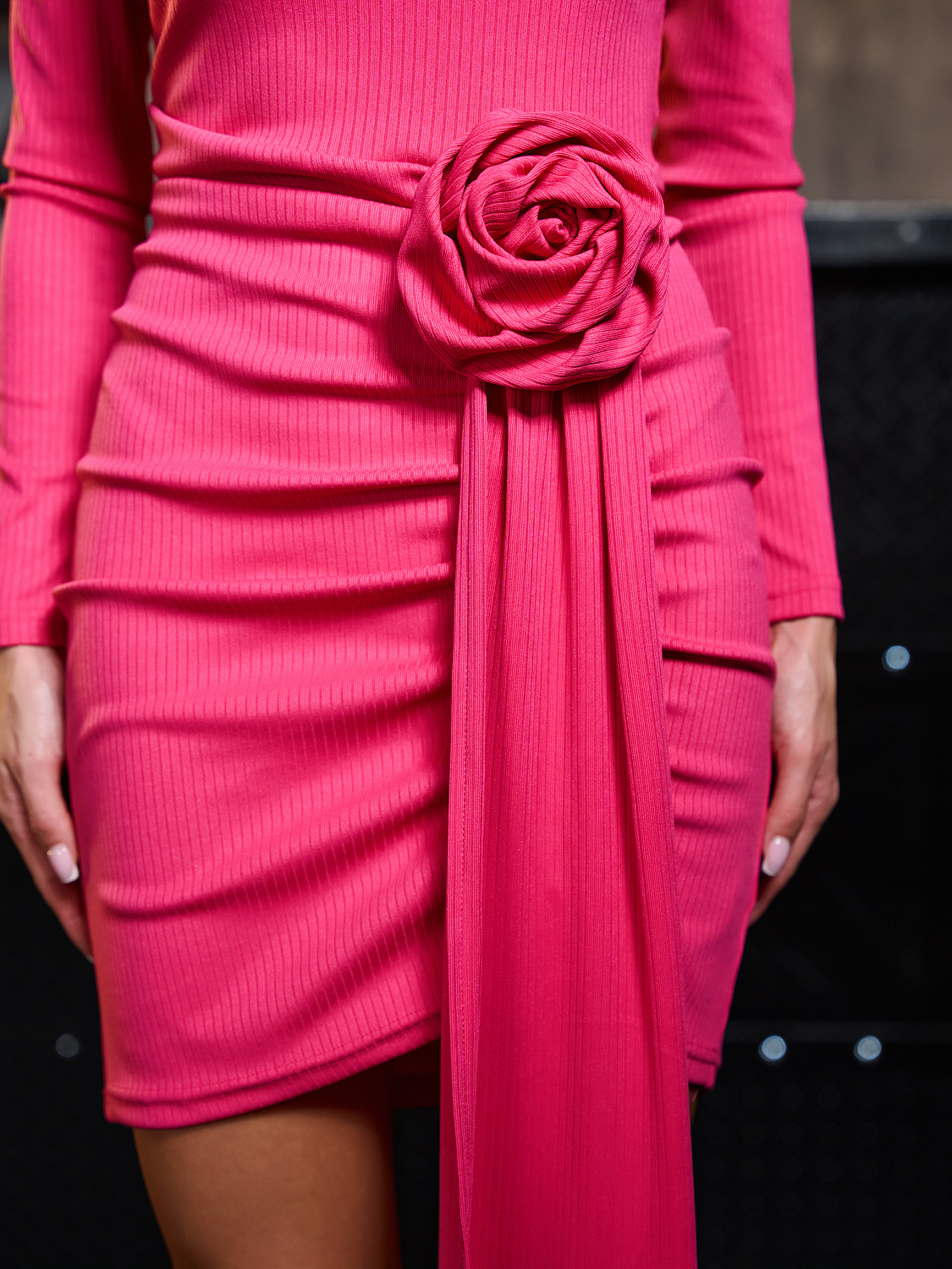 Трикотажное платье прилегающего силуэта длины мини. V-образный вырез горловины. Длинные втачные рукава. По линии талии декорировано цветком из основной ткани.
