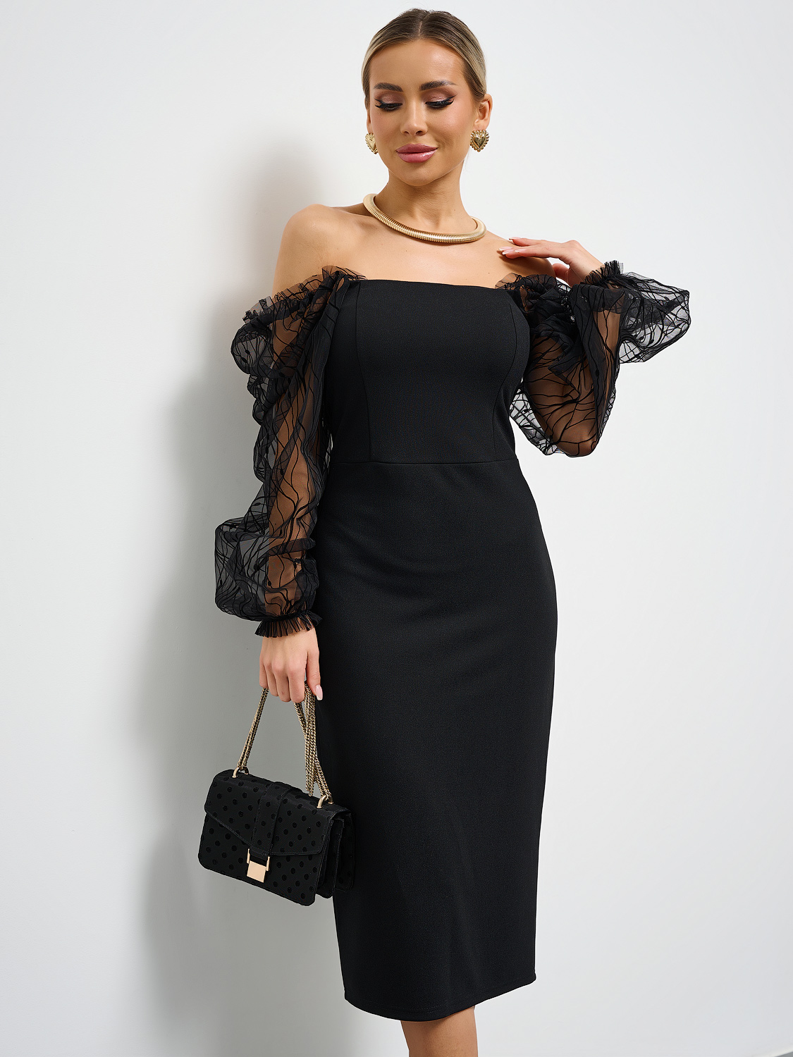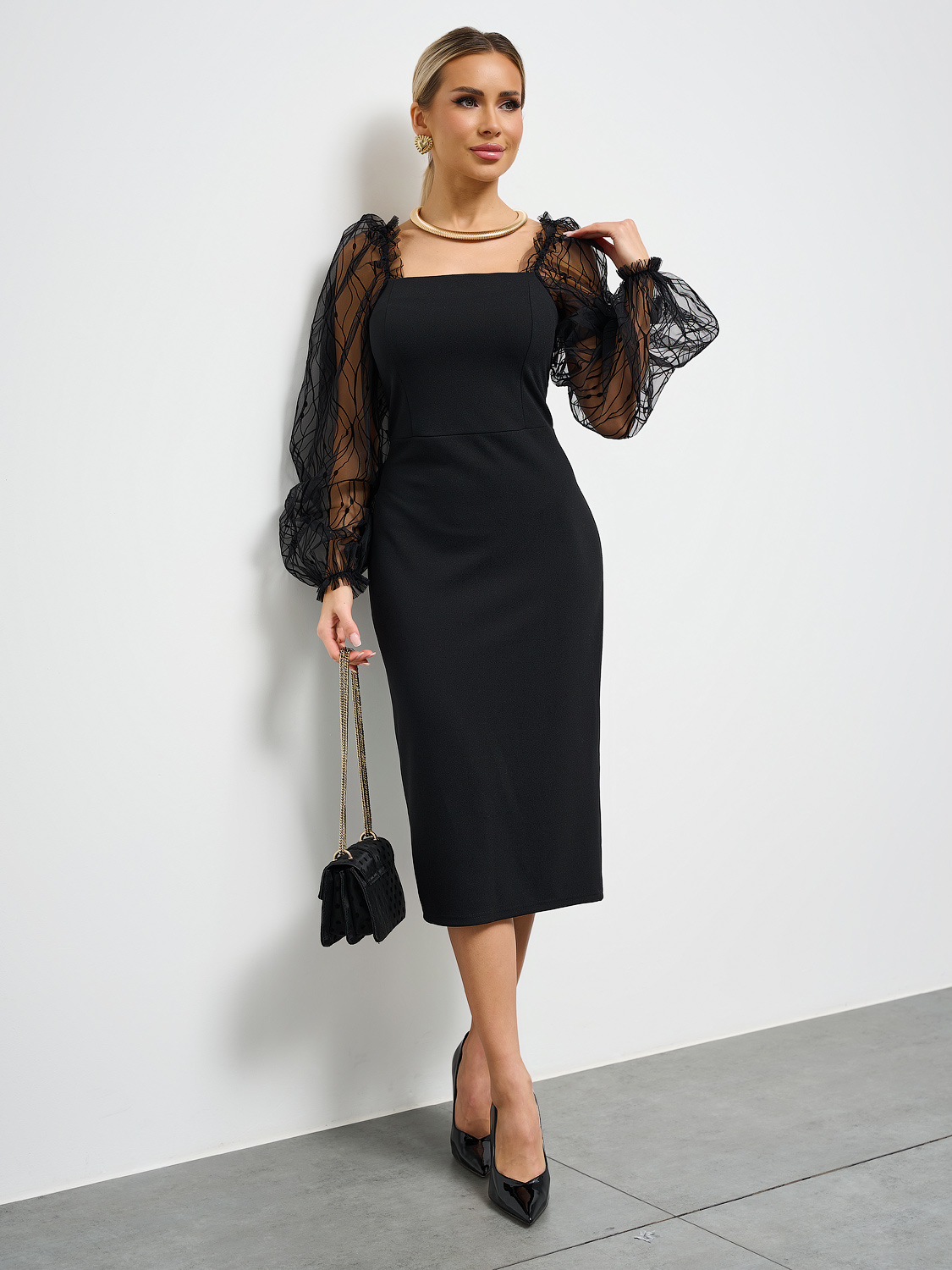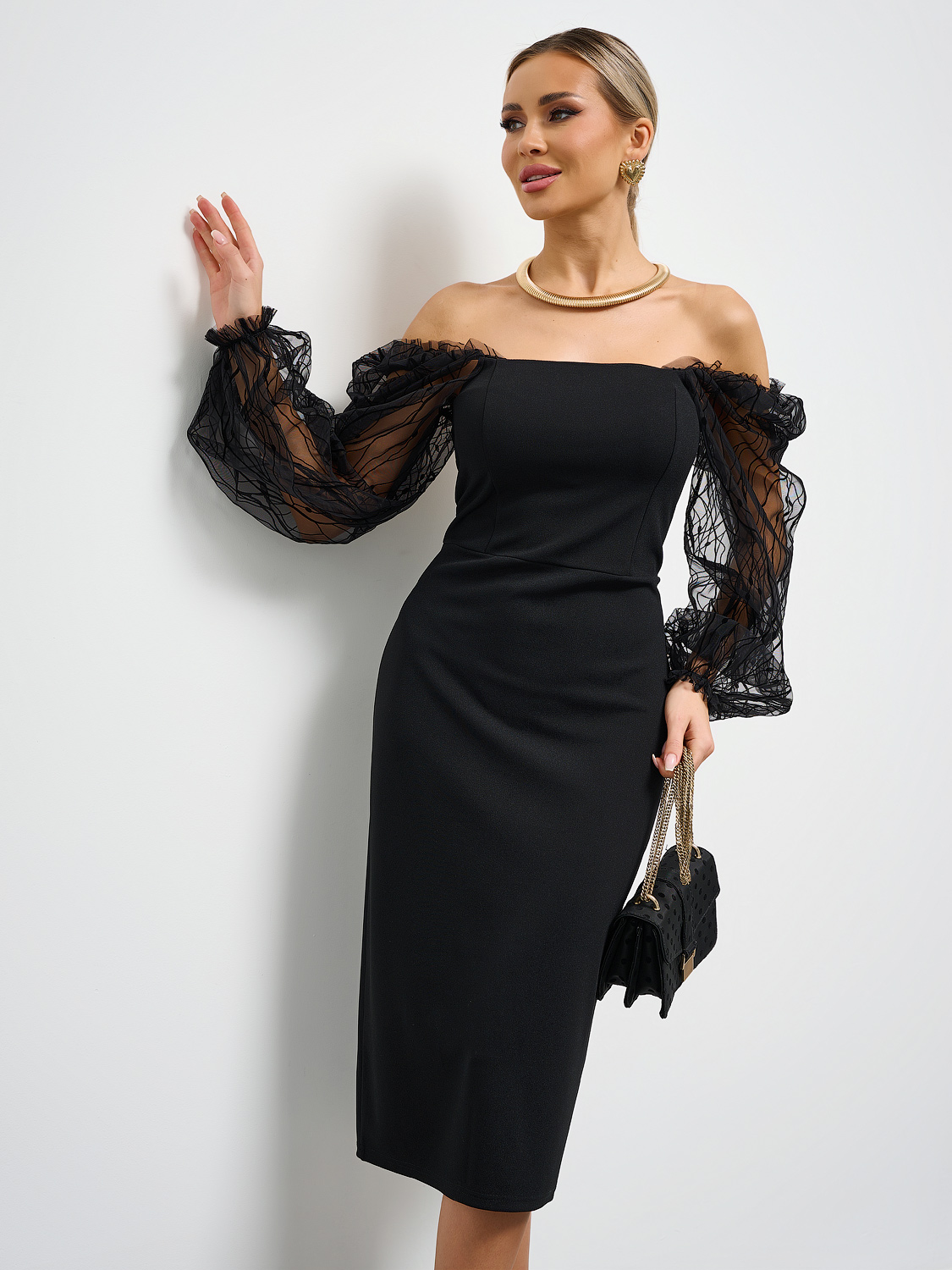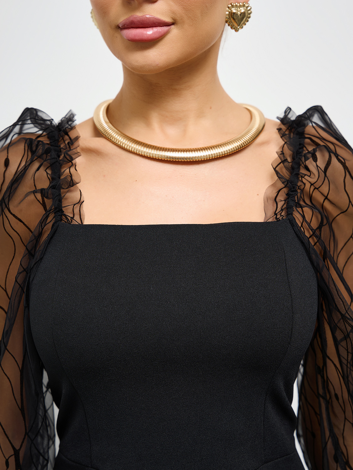 Платье из трикотажа, отрезное по линии талии, с рельефным верхом. Рукава выполнены из сетки с рисунком.
