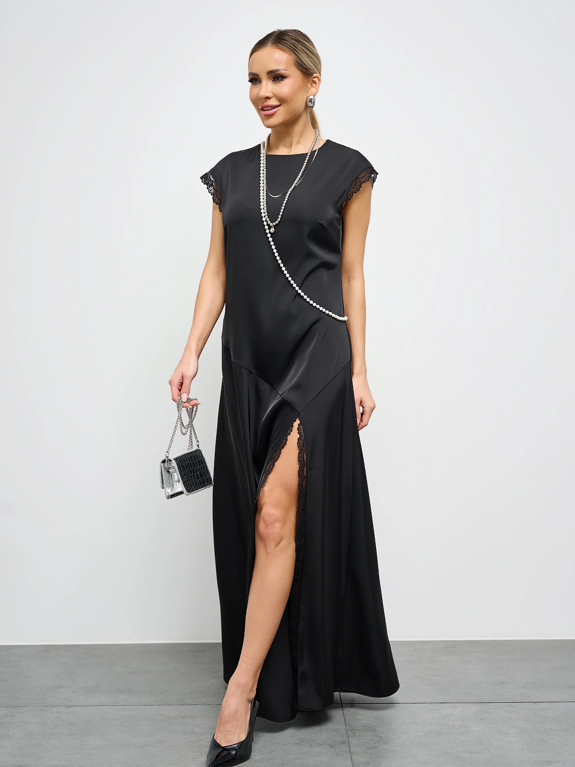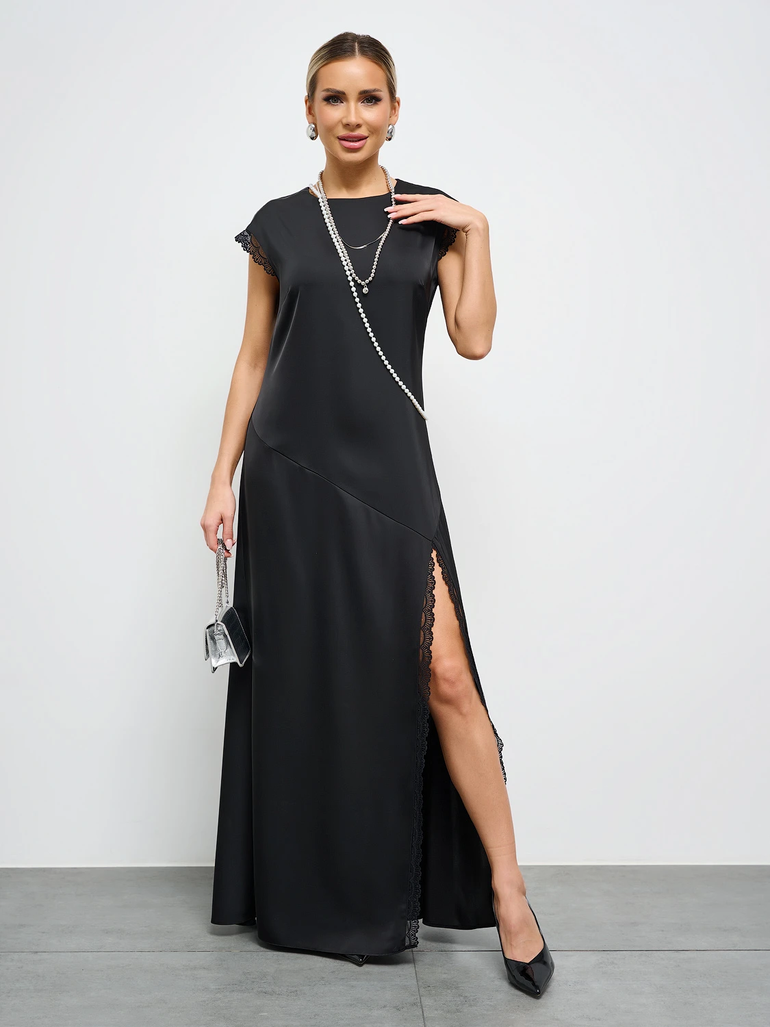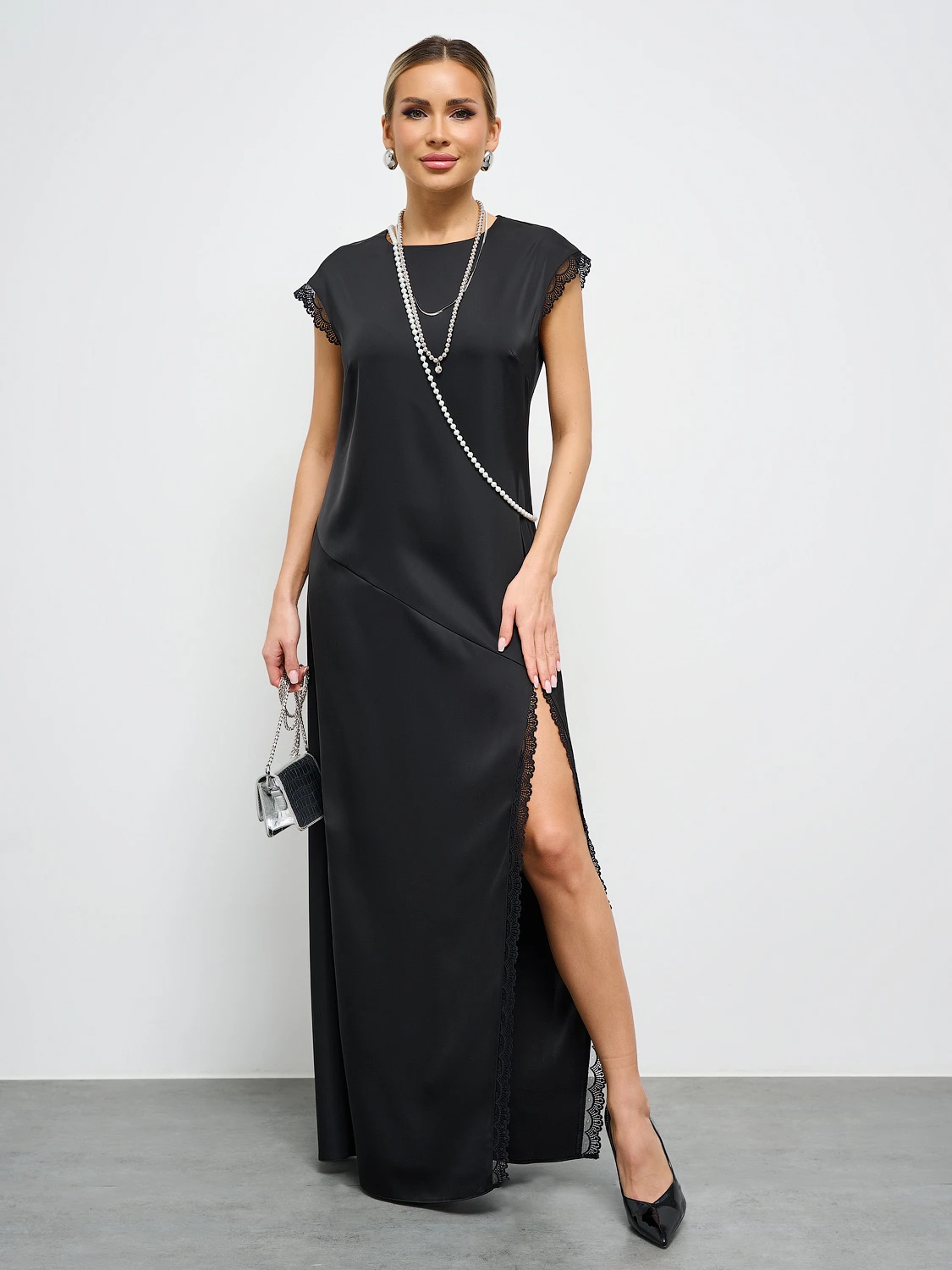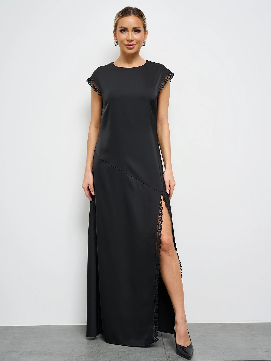 Эффектное платье из японского шелка. По переду высокий разрез, оформленный трендовым кружевом. Круглый вырез горловины, сзади застежка на пуговицу.