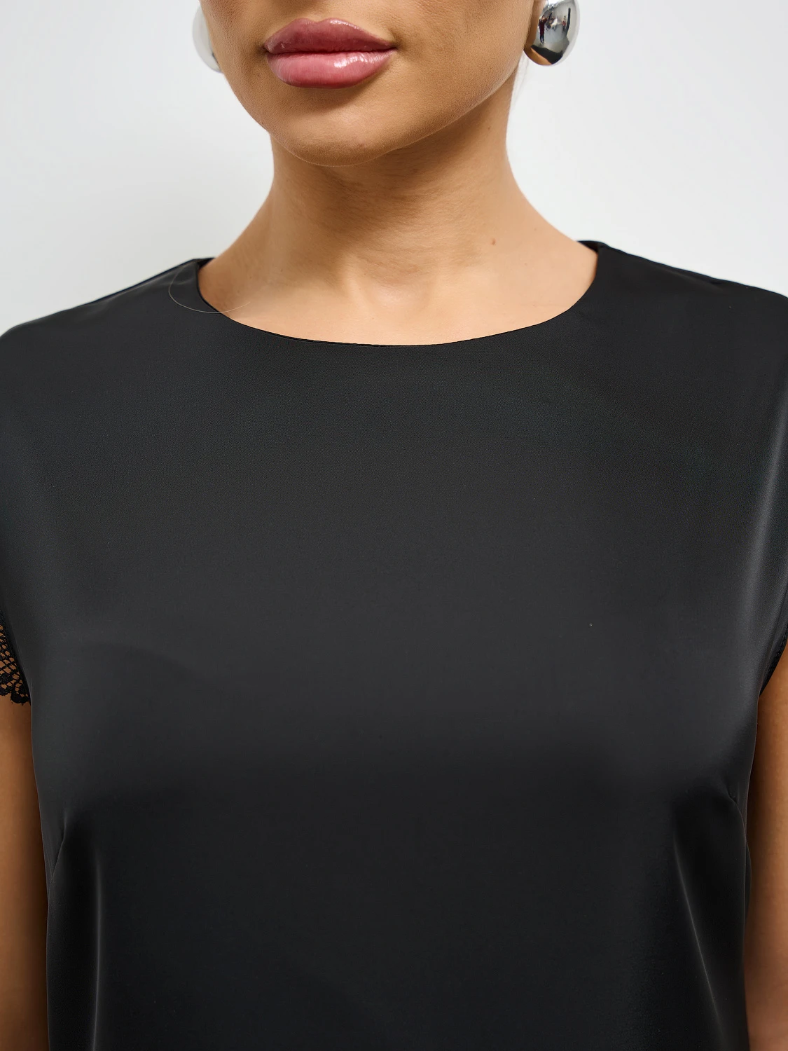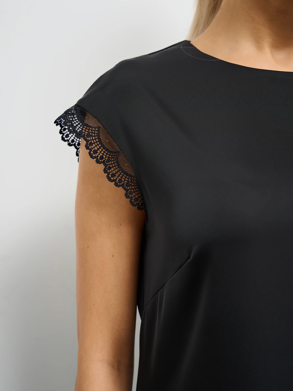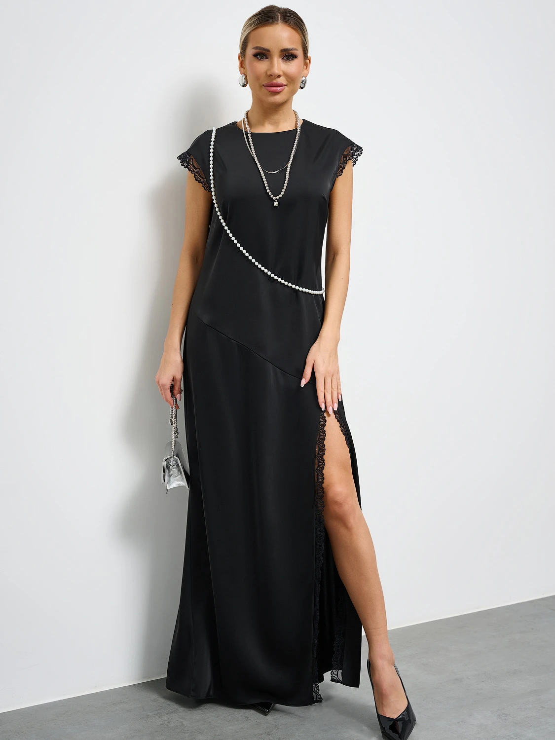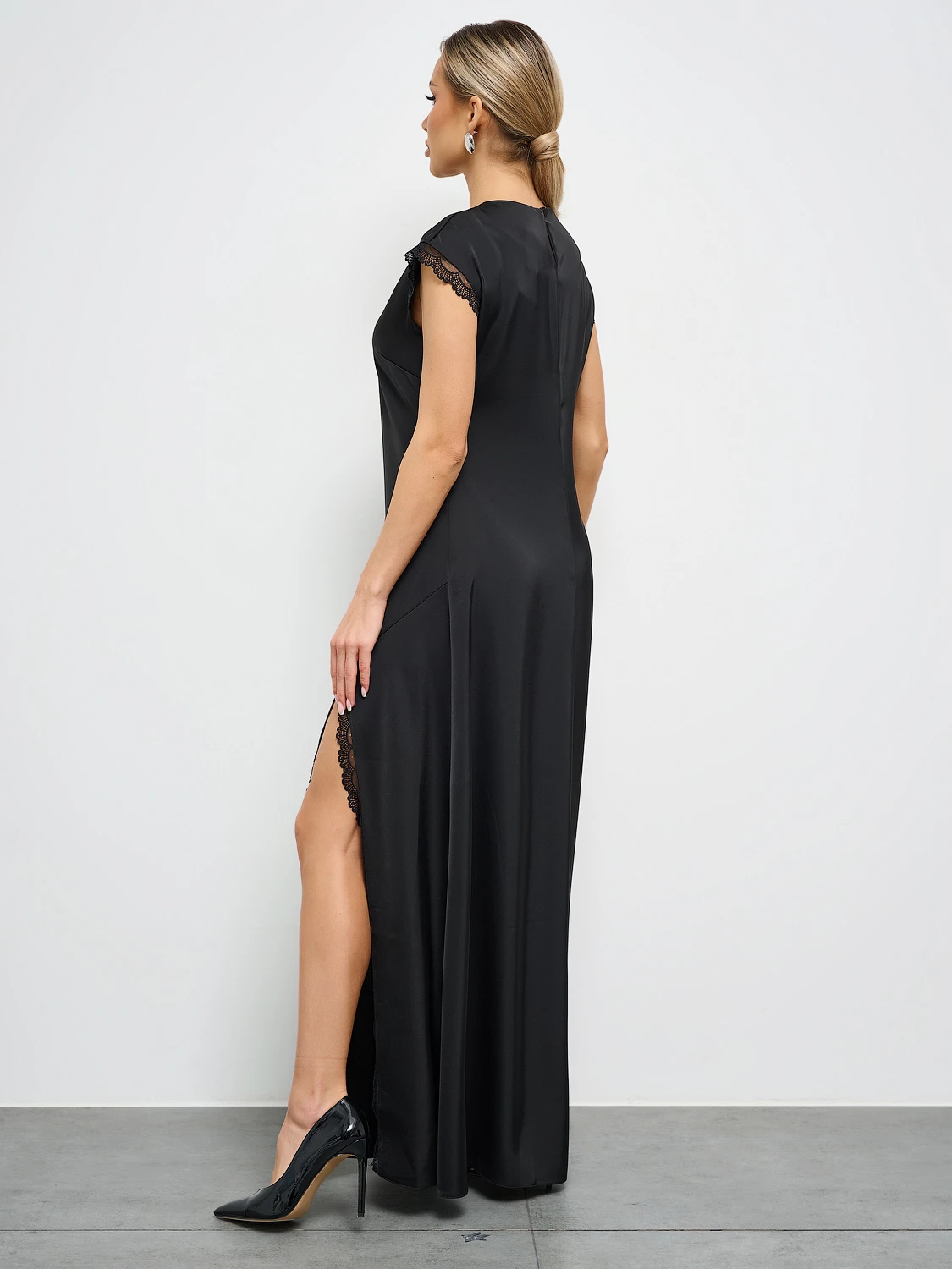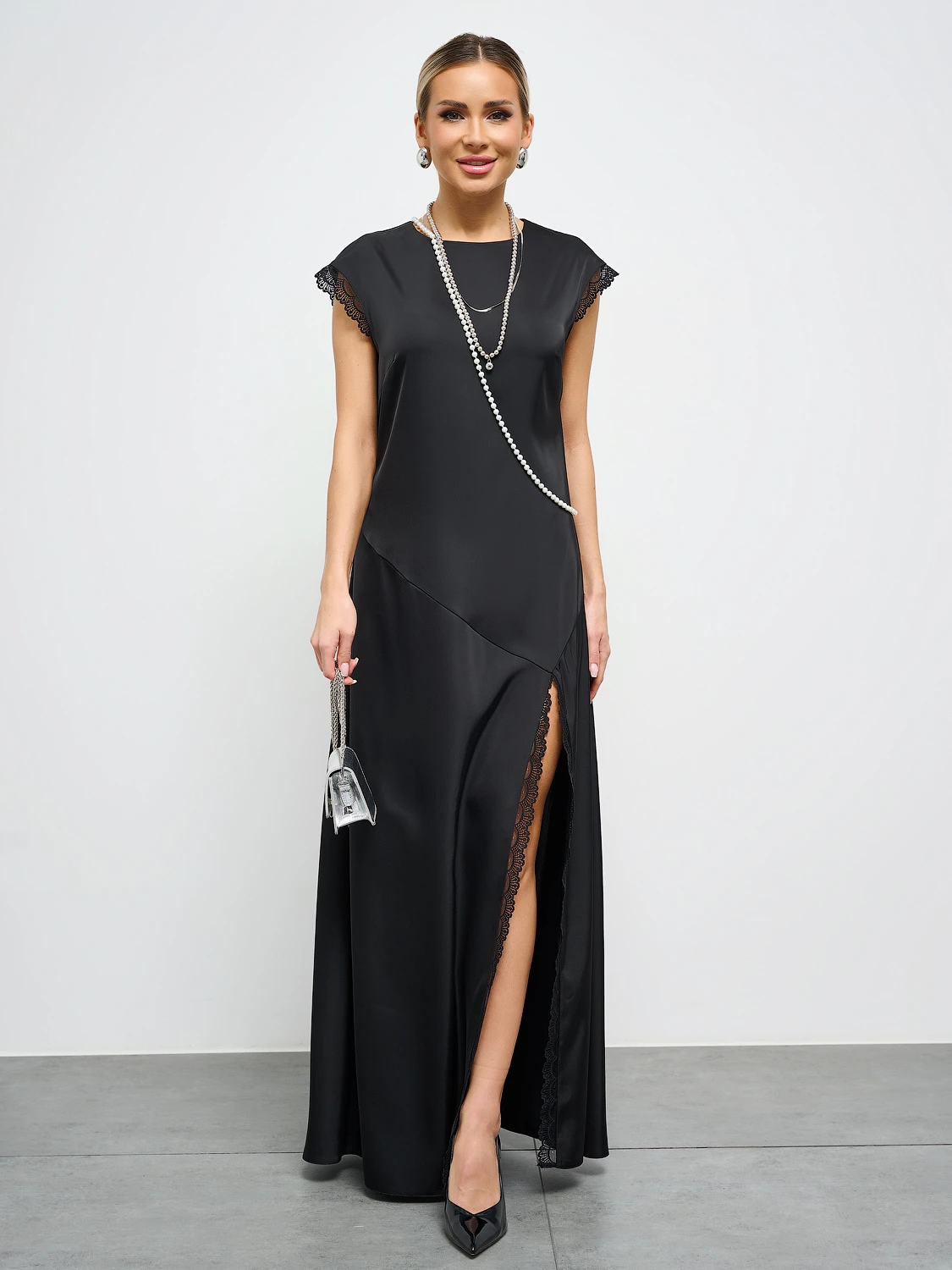 Эффектное платье из японского шелка. По переду высокий разрез, оформленный трендовым кружевом. Круглый вырез горловины, сзади застежка на пуговицу.